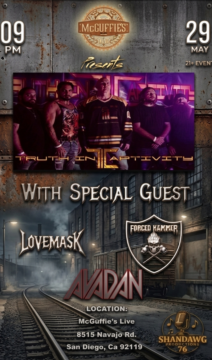 Join us for the first Avadan show at McGuffie’s! We’ll be supporting Truth In Captivity, and playing alongside Lovemask and Forced Hammer. See you there!